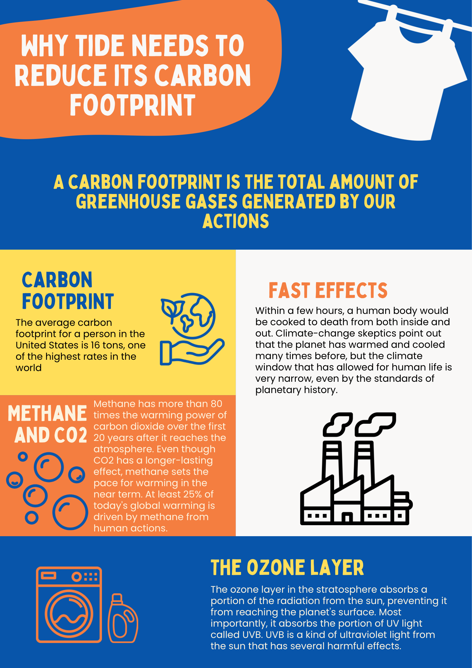 Infographic titled 'Why Tide Needs to Reduce Its Carbon Footprint,' discussing the environmental impact of carbon emissions. Highlights include the definition of carbon footprint, the average US carbon footprint, impact of methane and CO2, climate change effects, and the role of the ozone layer.